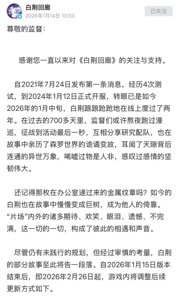 #白荆回廊官宣停止周期性更新 #今天游戏圈发生了啥 唉,终于,果然?烛龙的《白荆回廊》也决定停止周期性更新了,说是之后改为不定期,但是……懂都懂,这步基本是就是凉凉的前步了