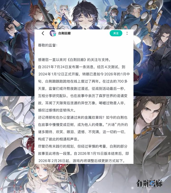 2026年1月14日,《白荆回廊》官方发布更新调整公告,正式官宣自2026年2月26日起停止全新版本的周期性更新。