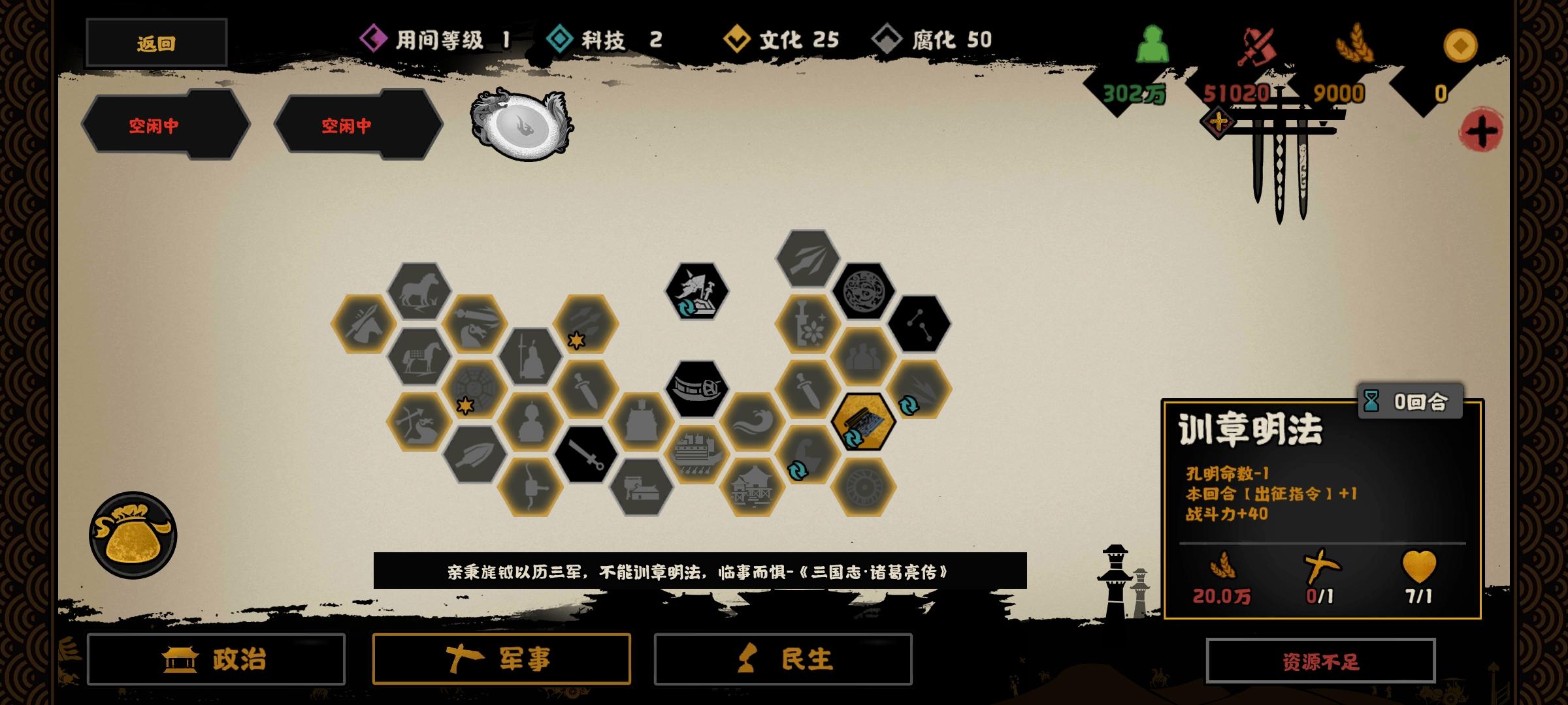 ,丞相的命先不卖,依靠名臣和政策加战斗力强取长安。蜀汉的钱粮产量比较低,拼发育并没有什么优势,理论上诸葛亮可以活30个回合,但实际上我们要在20个回合内结束战斗军事名臣方面强烈推荐;