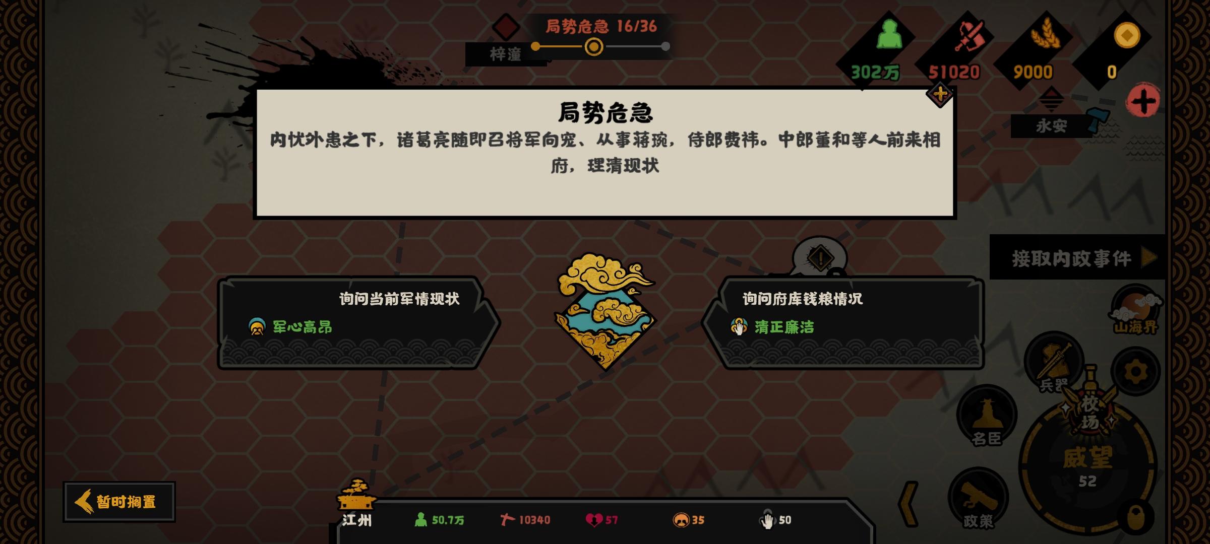 江东政局会影响钱粮产量,每一点政局大概1.5%左右,前期尽量把政局控制在15左右,不然很容易没钱