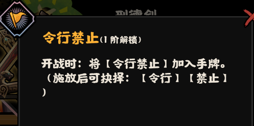 刑德剑技能“令行禁止”:开战时,将【令行禁止】加入手牌。(施放后可抉择:【令行】【禁止】);