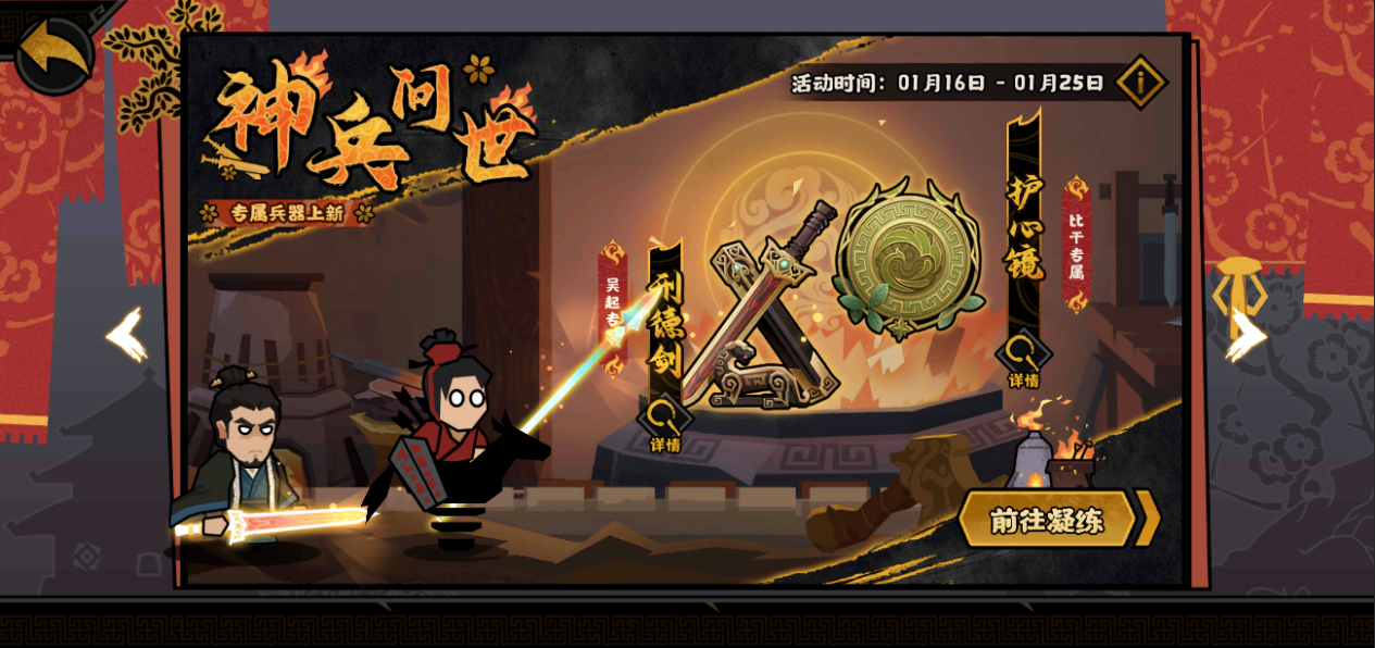 传说神兵即将破世而出!1月16日锋镝所指,山河皆震。吴起专属兵器“刑德剑”、比干专属兵器“护心镜”即将登场凝练商店!一起收集神兵,提升战力吧!