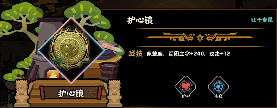 护心镜技能“护心”:佩戴者附近兵团每2秒恢复5生命。佩戴者兵力小于50%时,效果翻倍;
