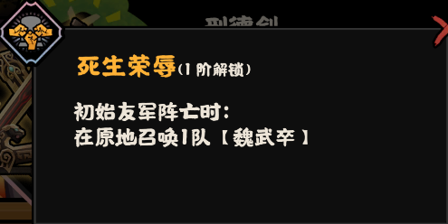 刑德剑技能“生死荣辱”:初始友军阵亡时,在原地召唤1队【魏武卒】;