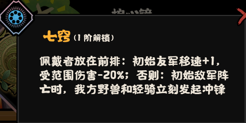 护心镜技能“七窍”:佩戴者放在前排,初始友军移速+1,受范围伤害-20%。否则,初始敌军阵亡时,我方野兽和轻骑立刻发起冲锋;