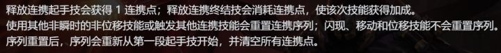 再看看连携描述,使用其他非瞬时的非位移的技能,会重置连携。那么只有使用瞬时的位移技能,才不会重置连携。