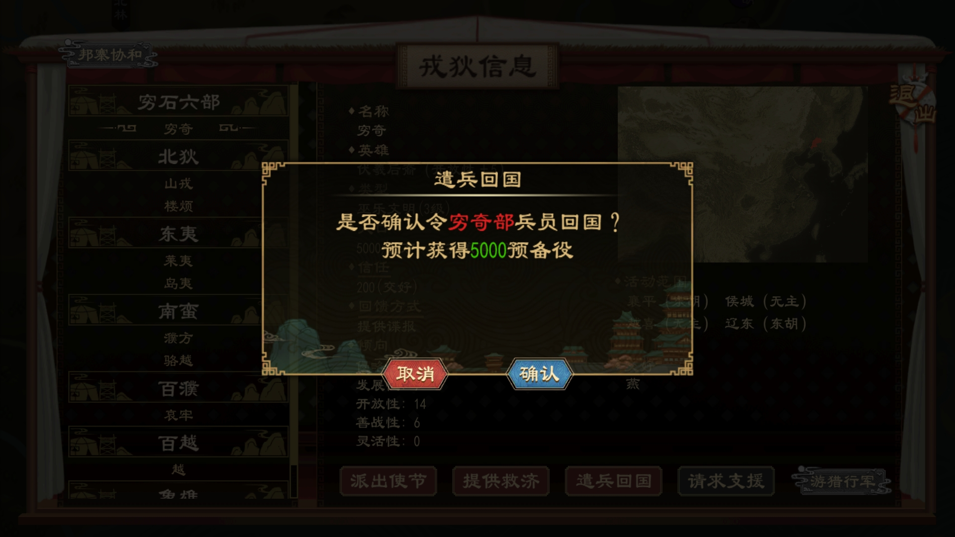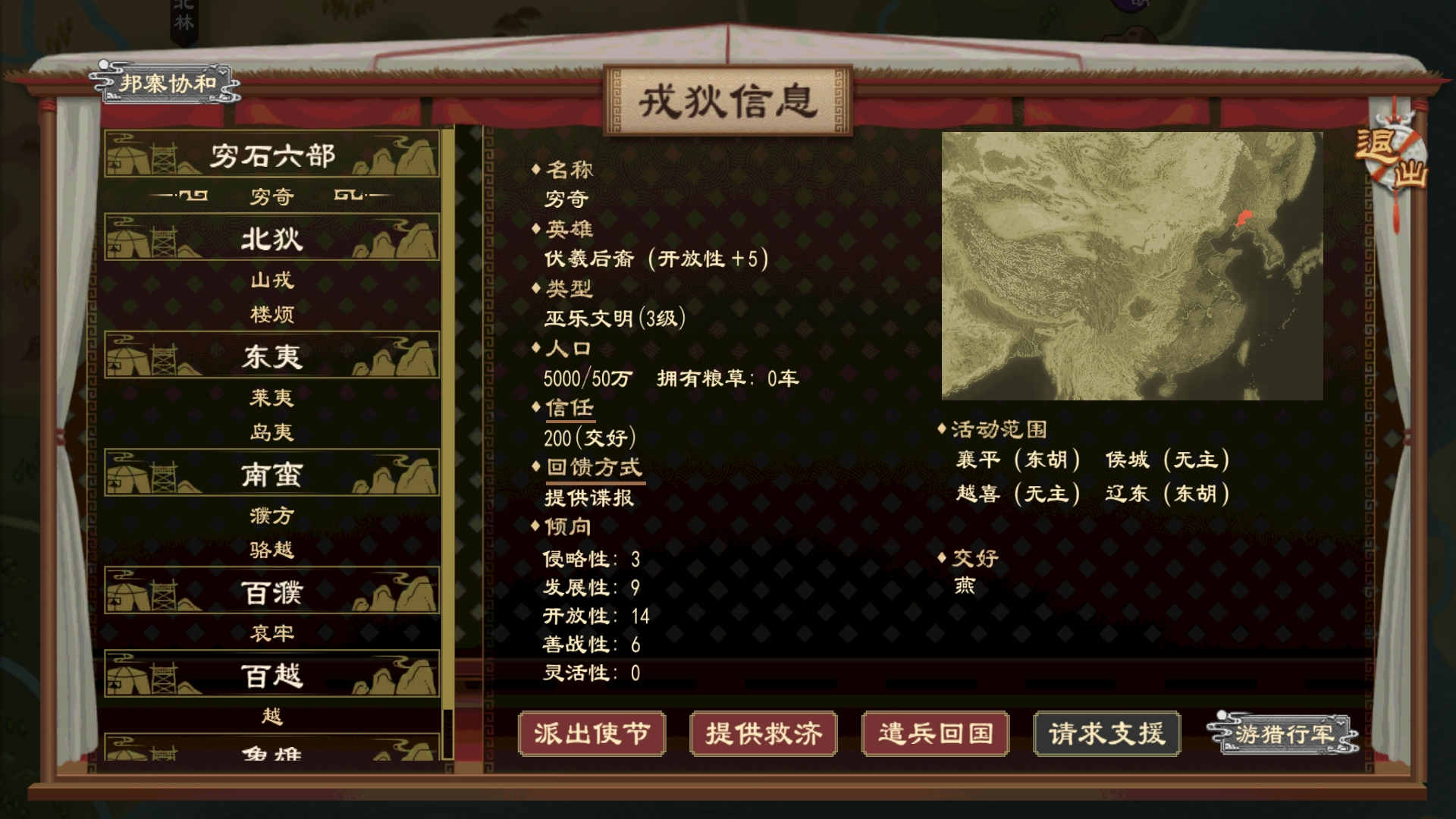 神祖穷羿担任君主或朝臣时,可消耗精力发动【邦寨协和】,派遣预备役前往指定范围组建与本势力同族域的戎狄部落,并将关系提升至交好。通过穷羿能力组建的部落,也可以通过“遣兵回国”按钮解散回国,并获得对应部落的人口充作本国预备役。