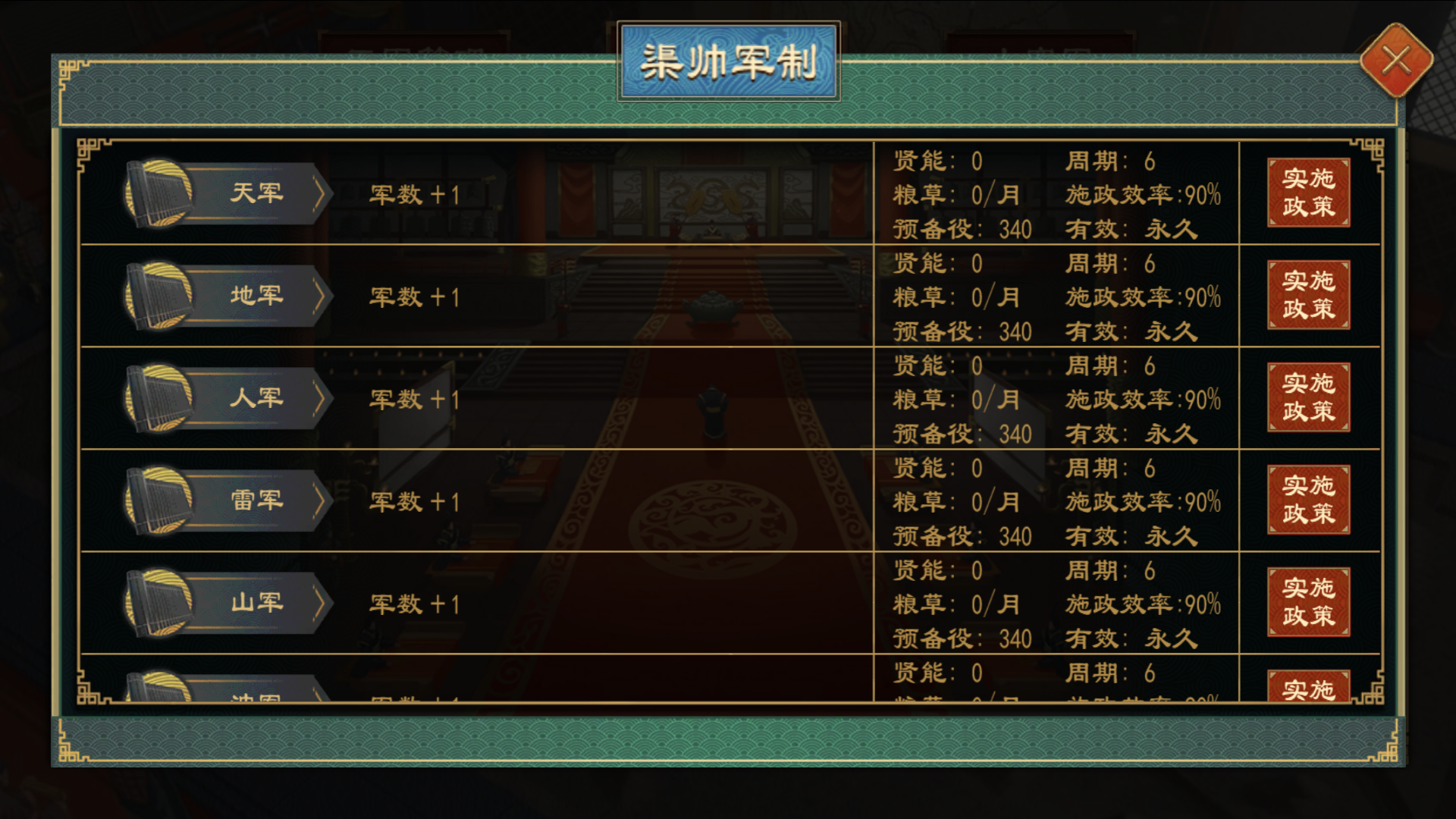 割据军阀可以创建独特的部曲军制与郡府军,部曲军制拥有中军、前军、后军、左军、右军共五军;郡府军初始上限为0,完全控制郡区则可以增加郡府军上限。