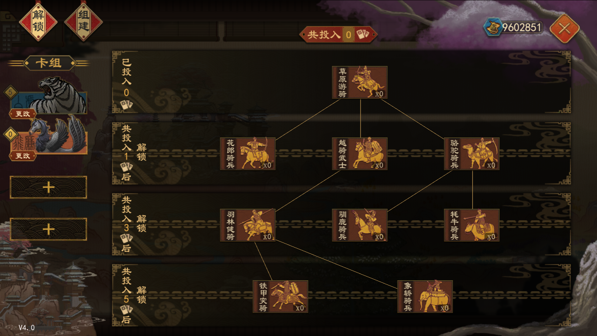 草原游骑、花郎骑兵、越骑武士、骆驼骑兵、羽林健骑、驯鹿骑兵、牦牛骑兵、铁甲突骑、象轿骑兵;