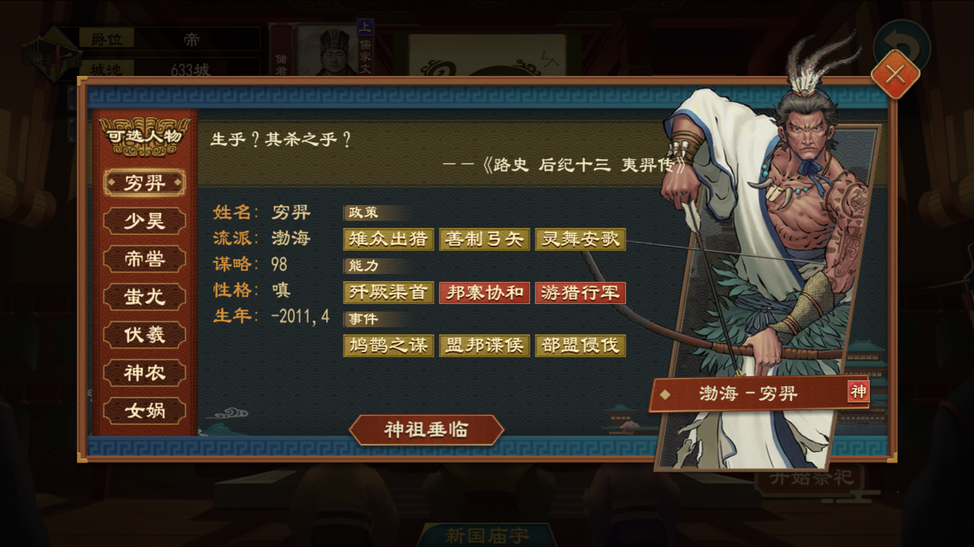 神祖穷羿担任军队将领时,可消耗精力发动【游猎行军】,指定与我方交好部落活动范围内的任意城邑,穷羿作为主帅统领军队无视外交关系行军至该城邑,期间不会与敌对军队遭遇。