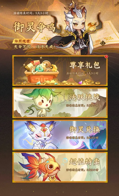 御灵专属活动「御灵争鸣」登临仙界!活动期间,道友们可通过完成【活跃挑战】或购买【尊享礼包】进行御灵兑换,更有【超值特卖】活动限时开启!具体活动内容如下: