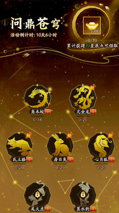 二十八星宿向各位道友发出了挑战!全新活动【问鼎苍穹】惊喜来袭!活动开启后,每天会解锁一个新的关卡。在每个关卡挑战前,道友都需要先自定义关卡难度,为怪物选择被动技能效果,难度越高通关后获得的奖励越丰厚。进入关卡后,需要进行10次挑战,每次挑战结束后血量将会继承到下次挑战,全部通关后才可领取挑战奖励。关卡难度奖励包括极品伙伴自选、飞升灵珠、高级召唤券、天相材料、海量元宝等。活动期间累计通关70难度点,可直接获得5000元宝大奖!