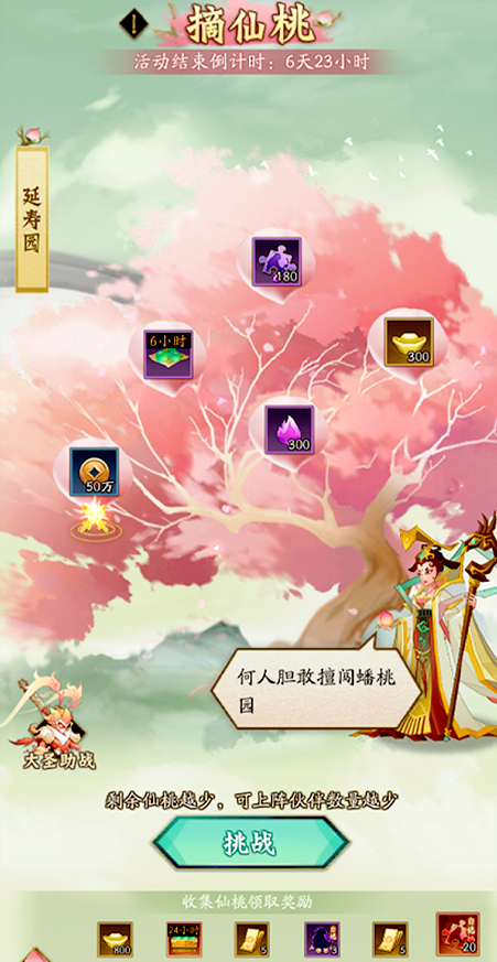 【摘仙桃】传承自神仙道IP经典玩法,活动期间蟠桃园每天解锁1个区域,不同区域对应不同的战场条件,每个区域5颗蟠桃,当区域中蟠桃剩余数量越少,摘取蟠桃时可上阵伙伴数量亦减少。活动期间累计获得指定数量蟠桃,可以领取进度奖励,包括限定神魔伙伴碎片和极品召唤券等。快来摘取仙桃,挑战蟠桃盛宴!