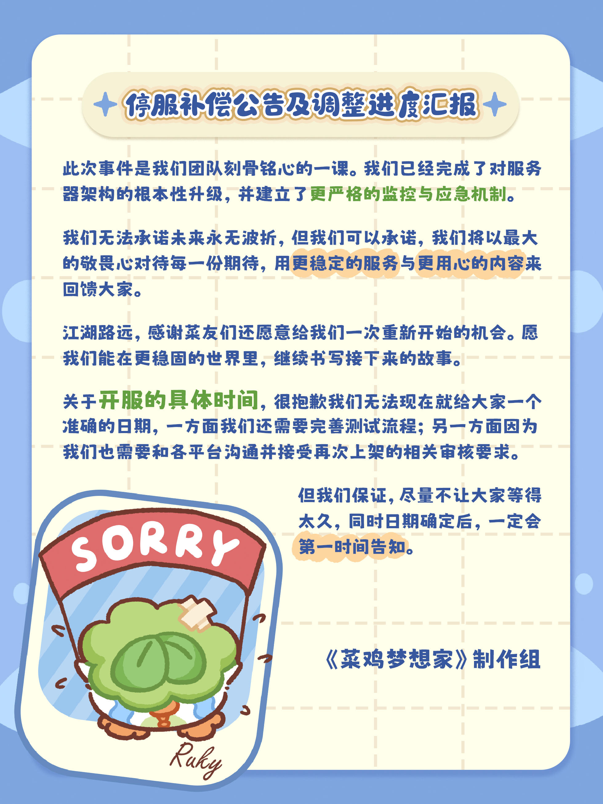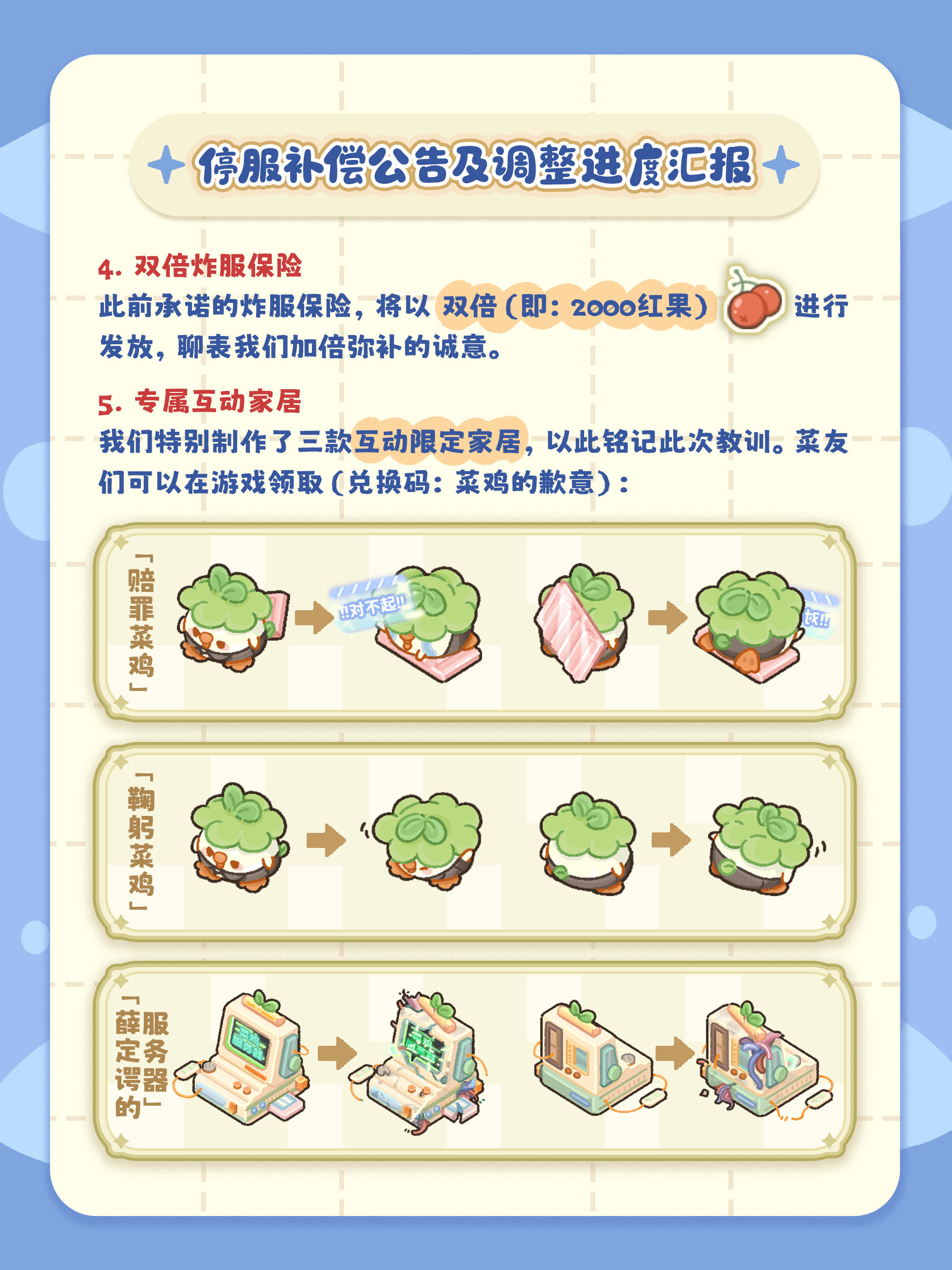 《菜鸡梦想家》停服补偿公告(套间服装大月卡等)及调整进度汇报