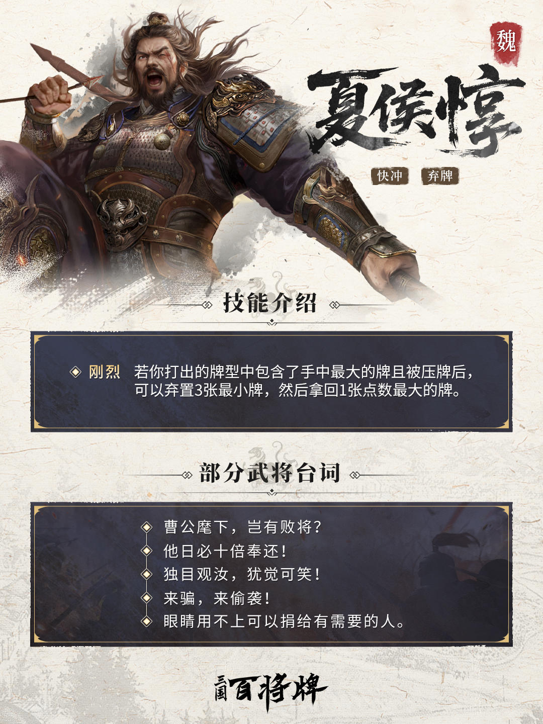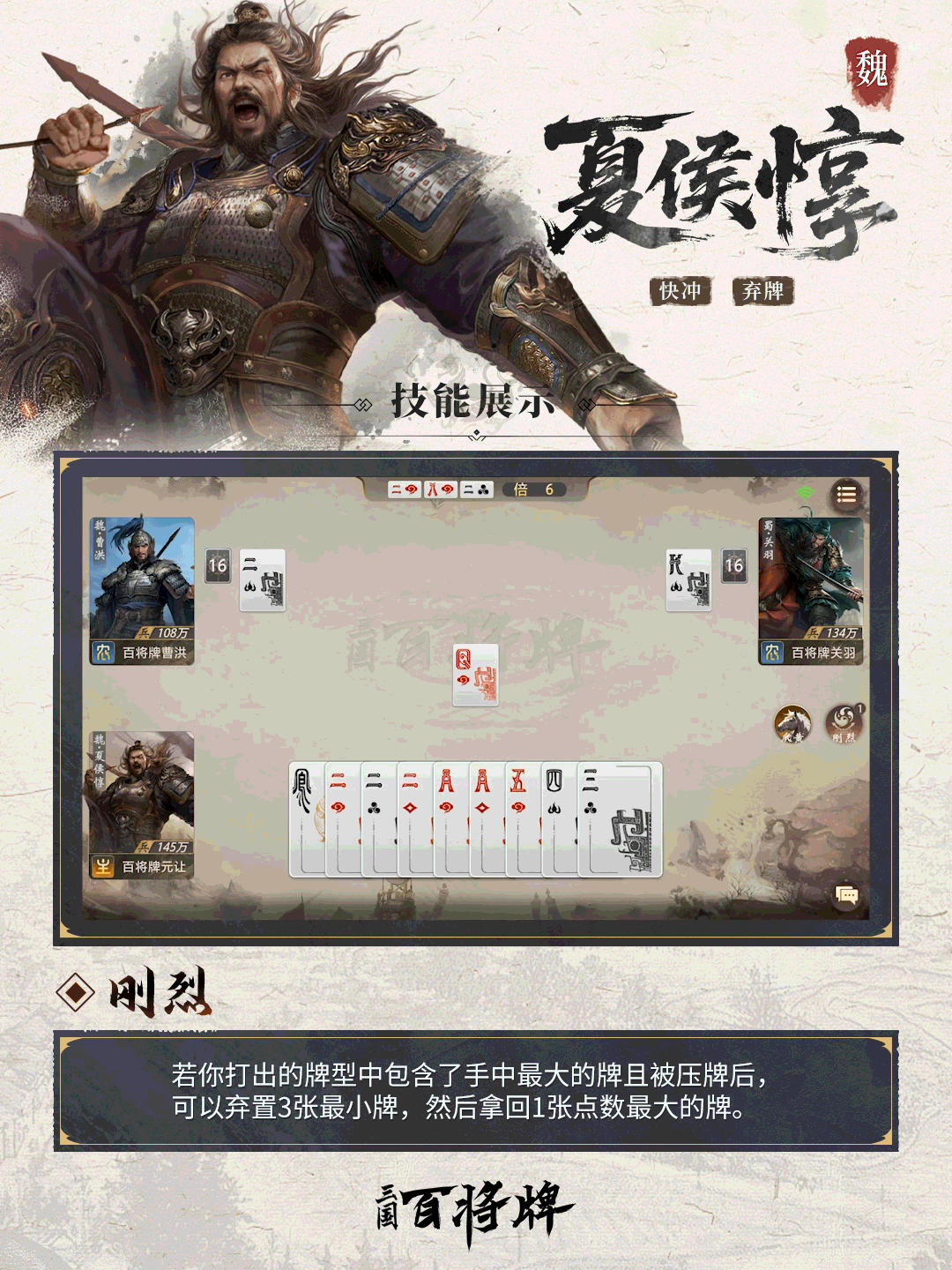◆技能简介:夏侯惇乃曹魏猛将,即便矢镞伤目亦死战不退,这份铁血气概在《三国:百将牌》中化作技能【刚烈】:当夏侯惇打出的牌型中包含了手中的最大牌,且该牌被压制后,可以弃置3张最小牌,并拿回1张点数最大的牌。