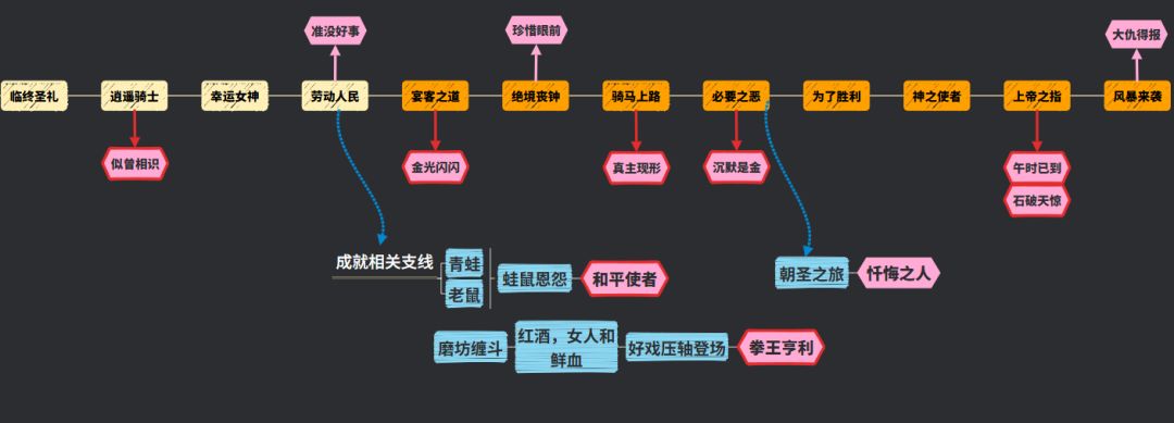 接下来我将奖杯分成行为杯和剧情杯,行为杯与游戏进度无关,只要满足条件了就能跳;剧情杯与主线支线的选择有关,具体在整个流程中的触发位置如下图(红框代表有错过风险),具体触发方法请看后文剧情杯部分
