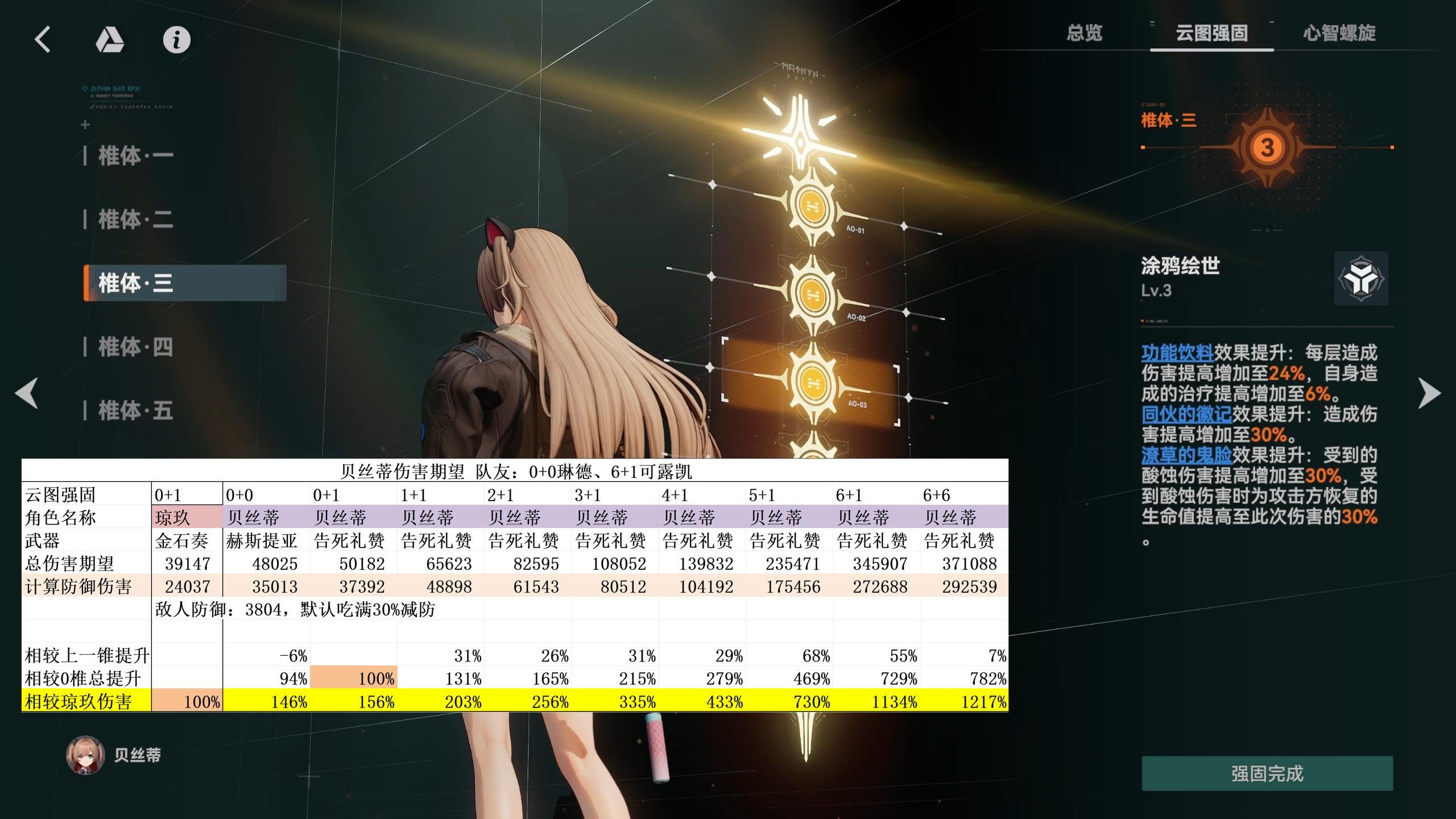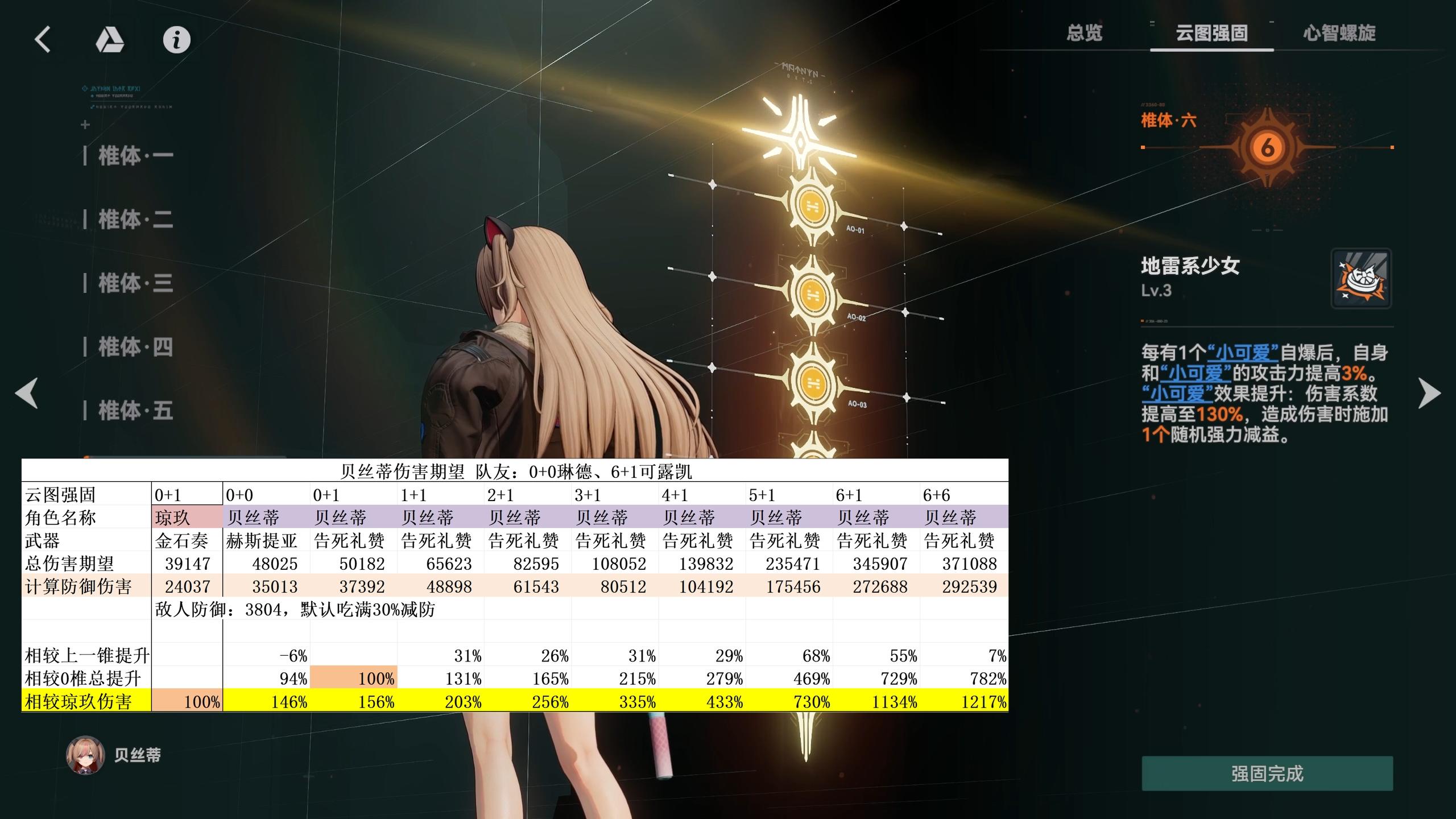 3椎贝丝蒂的辅助能力会达到完全体,对全队会贡献额外的30%增伤,对于可露凯的总伤害会再提升10%,性价比很低。贝丝蒂同样拥有辅助其他体系的能力,0椎为15%增伤,3椎为30%,对比2+1罗蕾莱少了15%增伤、6%攻击力、9%爆伤。不过相对的,满椎贝丝蒂的伤害是罗蕾莱的1.38倍,也算是平衡。