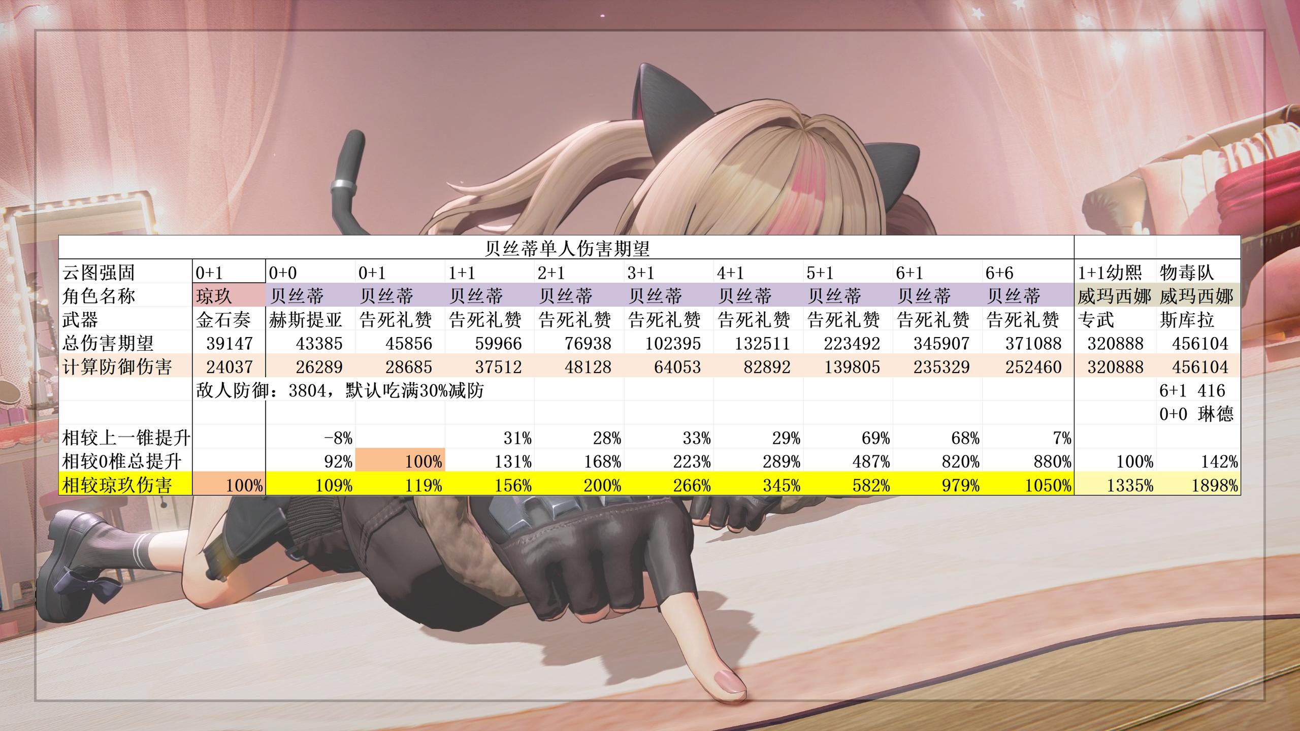 贝丝蒂虽然是支援角色,但是众所周知辅助同样也很能打,所以还是从输出能力入手。单人情况下,0+0贝丝蒂的输出期望为1.09玖,只能说聊胜于无。6+1贝丝蒂则能达到10玖的恐怖数值,而贝丝蒂作为辅助角色,自然是和其他毒队角色一起上场的。