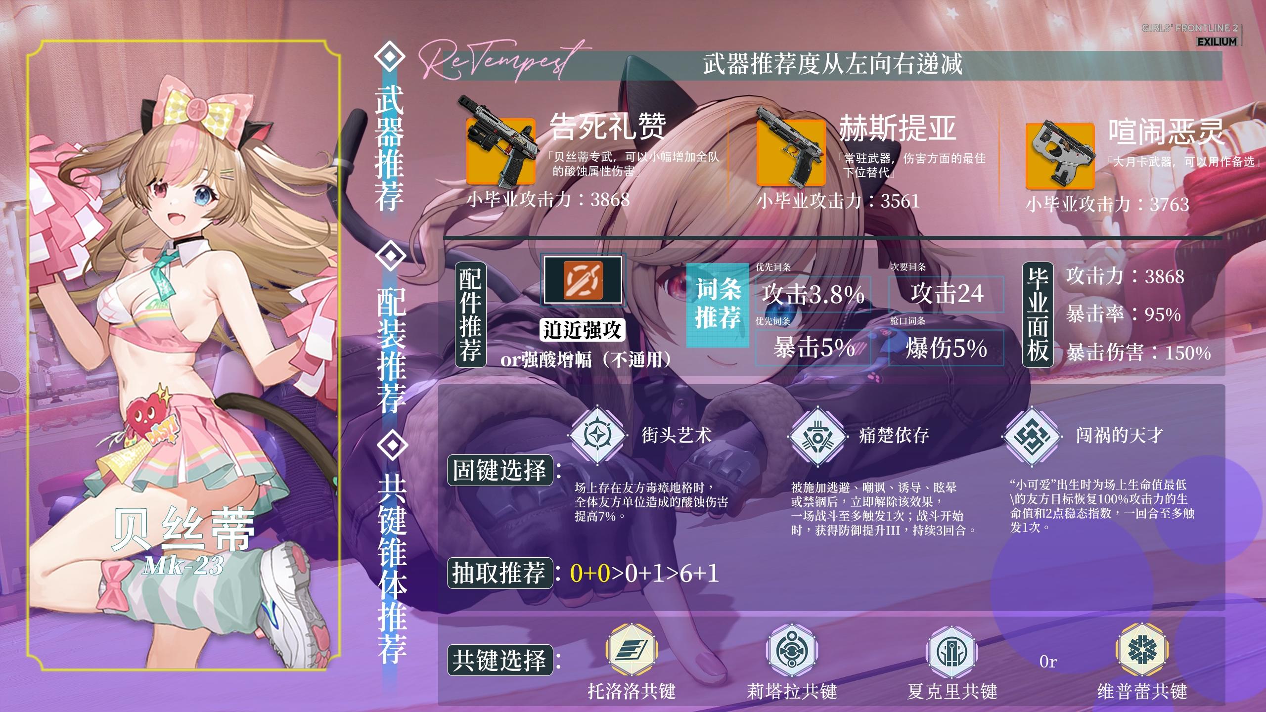 Ciallo~(∠・ω )⌒☆ 欢迎收看贝丝蒂的数据实测攻略这里是ReTempest这次的攻略发的比较晚,但是相对的用了更多的时间打磨的非常细~首先就是抽取建议,非常推荐拥有满椎可露凯的指挥官们抽取0+0。1+0性价比略低,满椎数值很高,强度党仅推荐0或6椎。