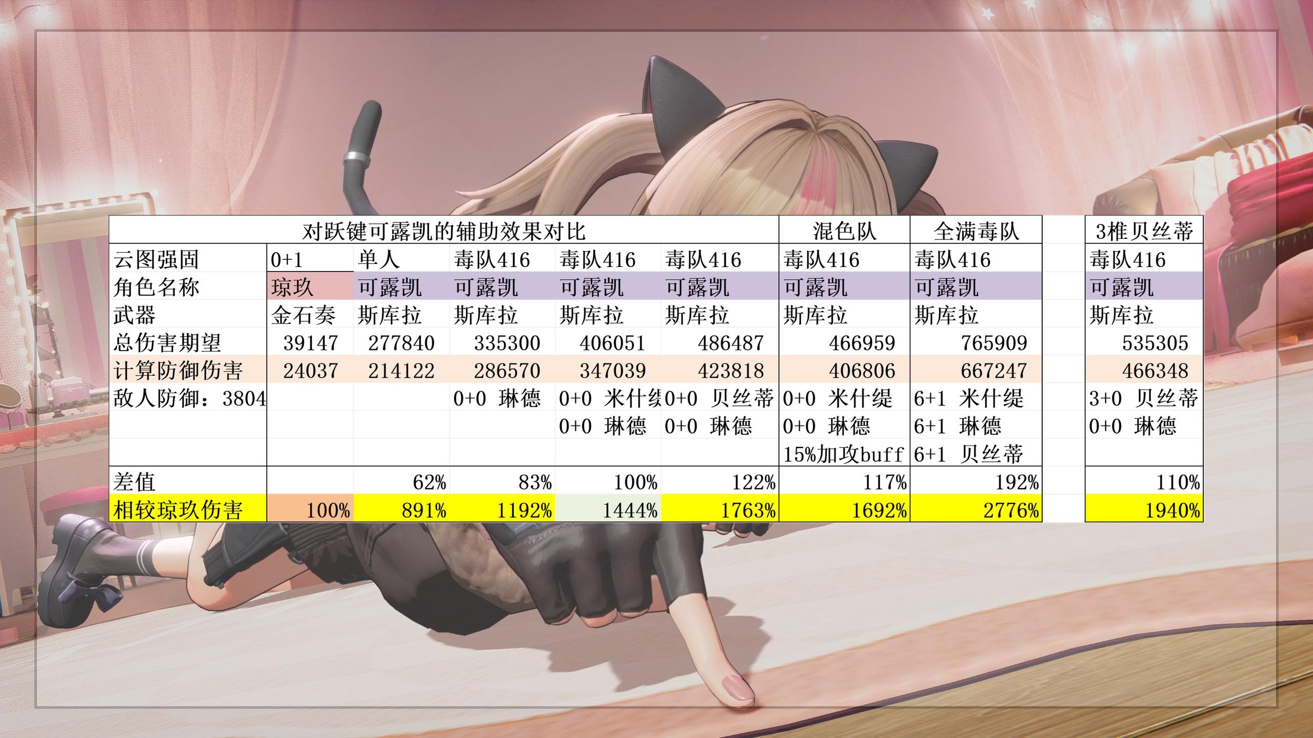 这时候就会有聪明的观众老爷们要问了,这贝丝蒂满椎12玖已经和威玛西娜一个级别了,是不是哪里算的有问题?答案也很简单,威玛西娜的辅助仅计算了1+1幼熙,对比可露凯的17玖也仅计算了0+0的贝丝蒂作为辅助,而贝丝蒂由于自己就是辅助,抽满即代表可以吃满拐,所以看似和可露凯的伤害差距不是很大,但是实际上满配毒队下的可露凯伤害已经达到27玖了,我计算低配辅助也是为了符合大多数指挥官的性价比抽取方案。不过在会战环境下,由于增伤稀释的缘故,满配和低配体系的伤害差距会缩小一些。