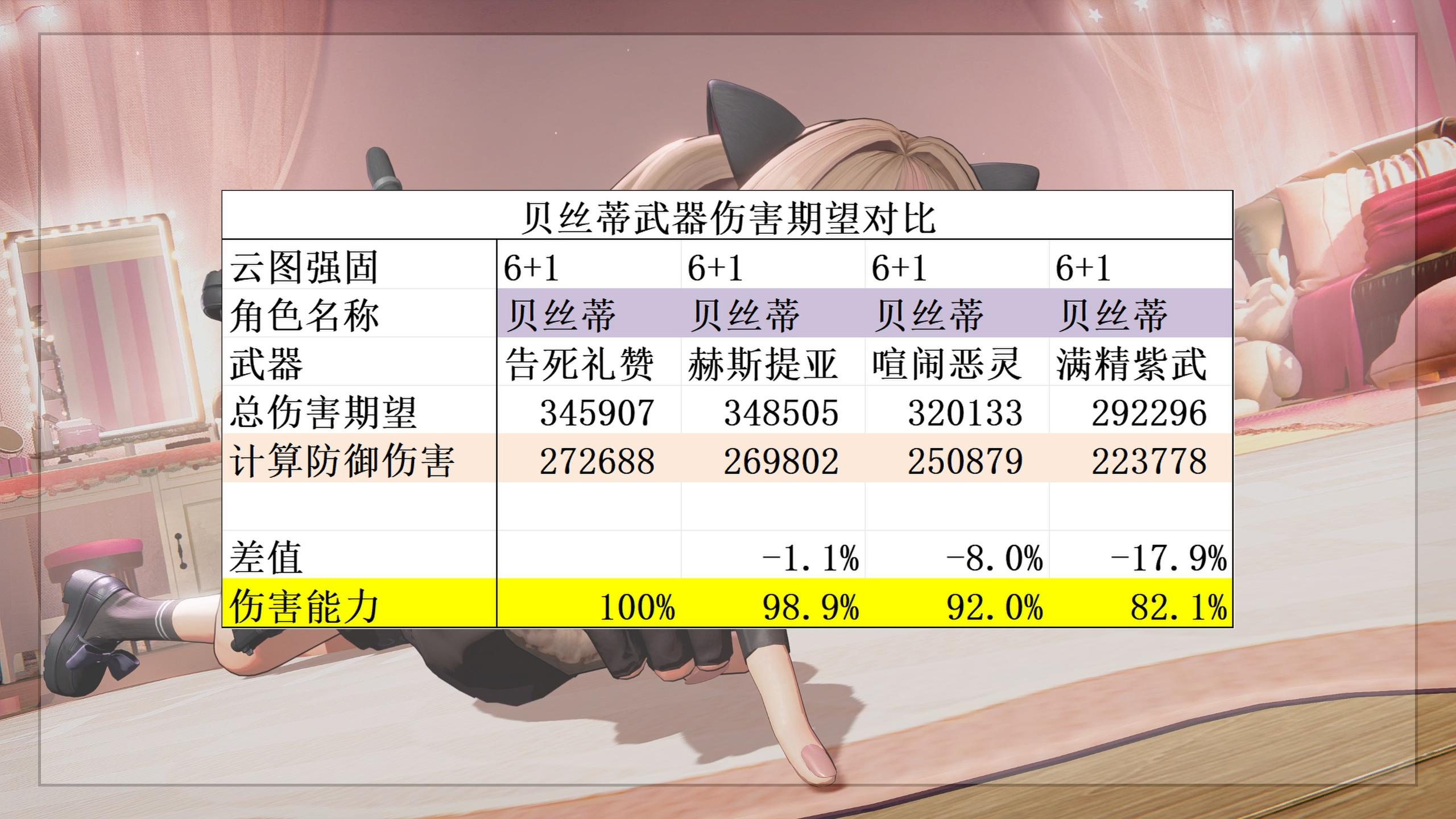 接下来就是贝丝蒂的武器选择了。常驻武器赫斯提亚在满椎情况下也仅和专武有1.1%的伤害期望差距,至于满精紫武的伤害差距非常大,如果是低椎的话其实用什么武器都可以,毕竟没什么伤害。