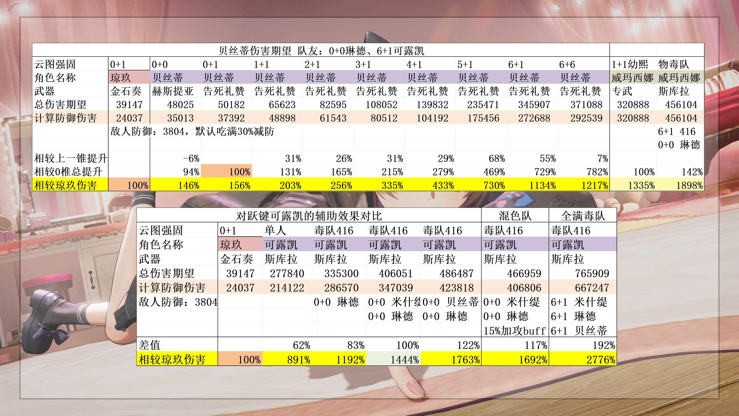 在毒队可露凯和琳德的辅助下,贝丝蒂0+0的伤害期望会达到1.46玖,而6+1则会达到12玖,已经非常可观了,对比同样是辅助的罗蕾莱的满椎仅有8.79玖,伤害约是满椎罗蕾莱的1.38倍。如果是对比同体系的输出角色,伤害大约是翡图萨的一半,可露凯的1/3。