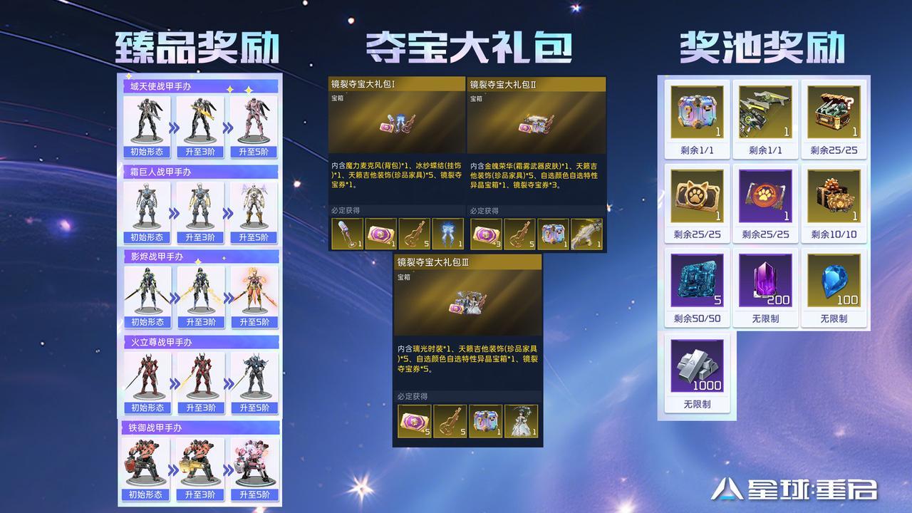 在战甲手办珍品家具盲盒中,可以收集5种珍品家具「影烬战甲手办I」、「霜巨人战甲手办I」「火立尊战甲手办I」、「域天使战甲手办I」、「铁御战甲手办I」,随着收集数量和种类变化,还有夺宝礼包相送!通过夺宝礼包可以活动魔力麦克风(背包)、冰纱蝶结(挂饰)、天籁吉他装饰(珍品家具)、金魄荣华(霜雾武器皮肤)、天籁吉他装饰(珍品家具)、自选颜色自选特性异晶宝箱、镜裂夺宝券等奖励。