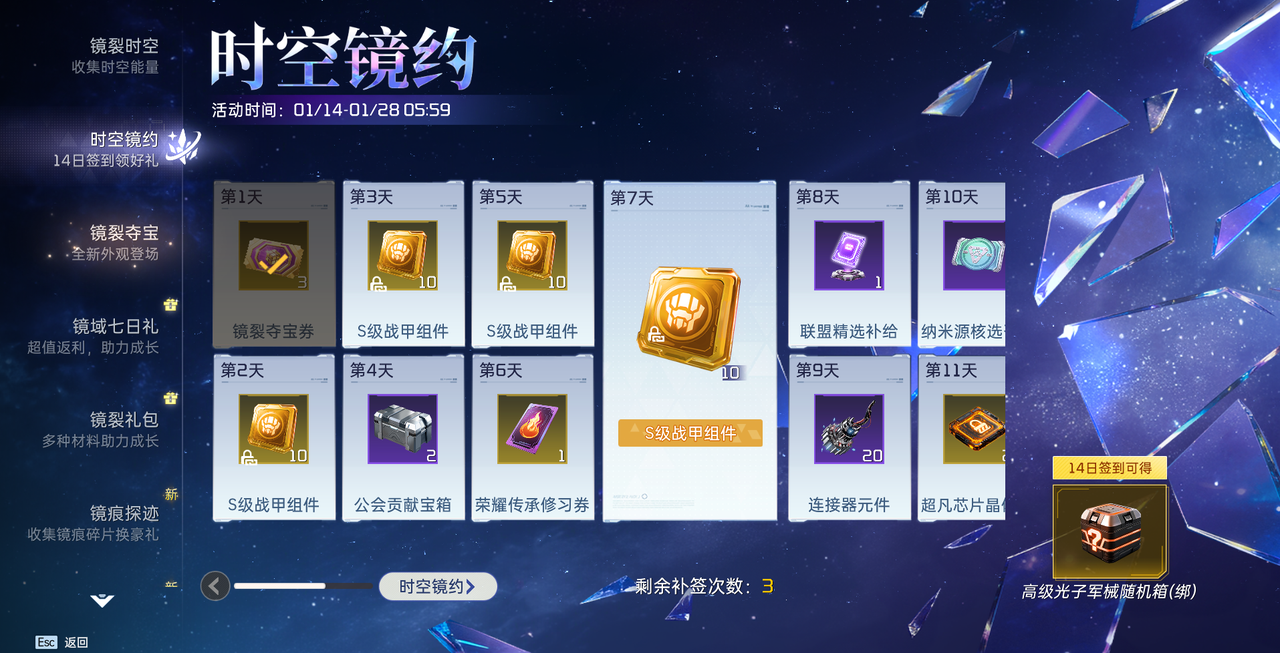 1月14日起,幸存者们期待已久的【镜裂夺宝】活动正式上线啦,美好的一天用新时装来解锁吧!消耗镜裂夺宝券可参与活动获得全新限定时装「璃光」等丰厚奖励~每次夺宝均会额外获得1~3个兑换点,每收集满6个兑换点,可随机开启一个战甲手办珍品家具盲盒,夺宝达到一定次数必出自选颜色自选特性异晶粗胚!