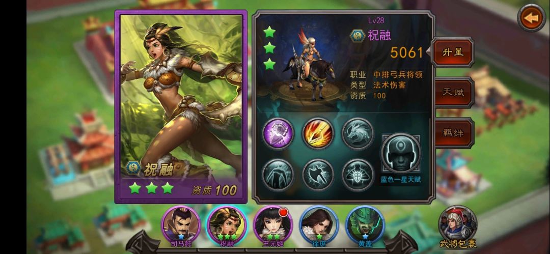 天赋按绿、蓝、紫共分为三层,每层又分三个阶段,随着武将星级的提升逐渐解锁。每解锁一个阶段,都会提升武将兵力、攻击、物防、法防等属性,以及其特有的被动技能,可以极大提升武将战力。