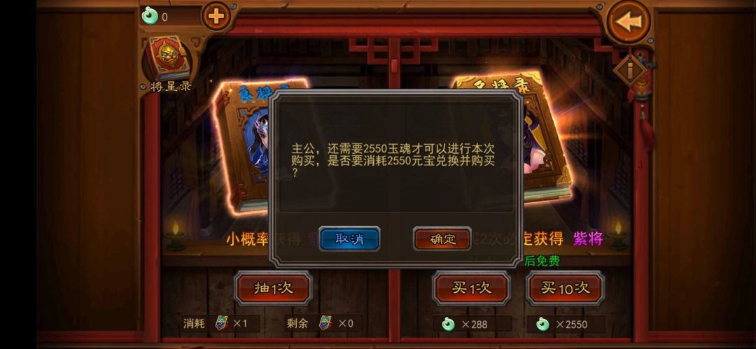 - 名将录除了每隔22小时的免费次数外,还可通过元宝购买玉魂进行抽取。