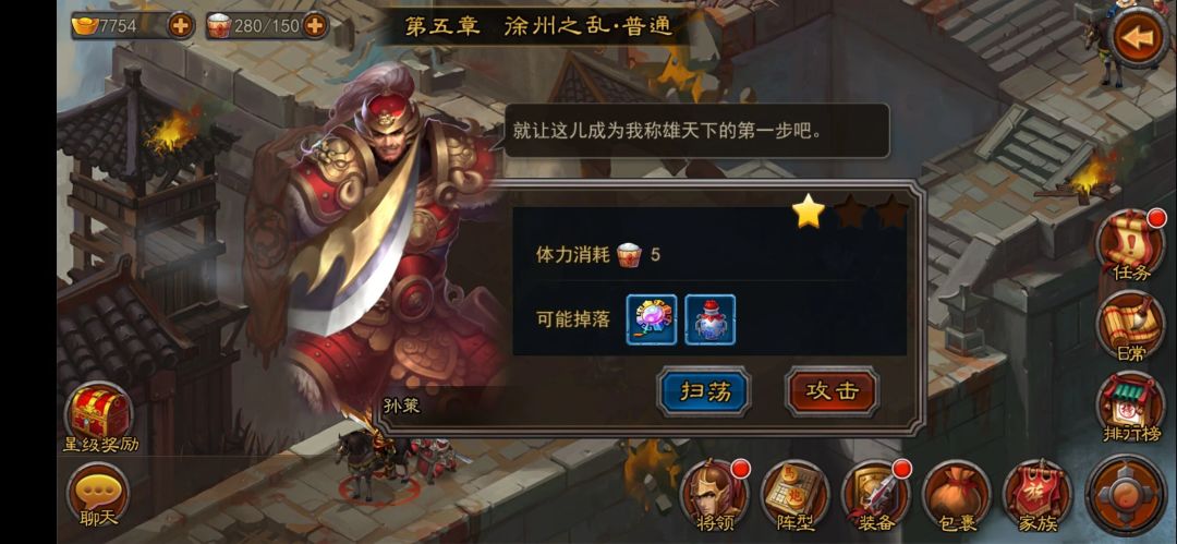 - 最关键:除了跟随主线之外,最关键的是自身的发展,加入一个活跃的家族,不仅可以获得升星丹、武将、装备、元宝、体力、将魂、宝石等资源快速发展,还可以得到一定的庇护。