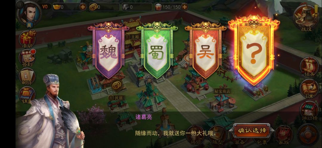 进入游戏的第一件事就是选国家,玩家可以选择自己喜欢的国家,也可通过系统随机选择。随机选择国家的玩家,可直接获得VIP1哦~除此之外,不论哪个国家,初始武将都一样,分别是“良将录”首抽的王元姬、“名将录”首抽的司马懿。
