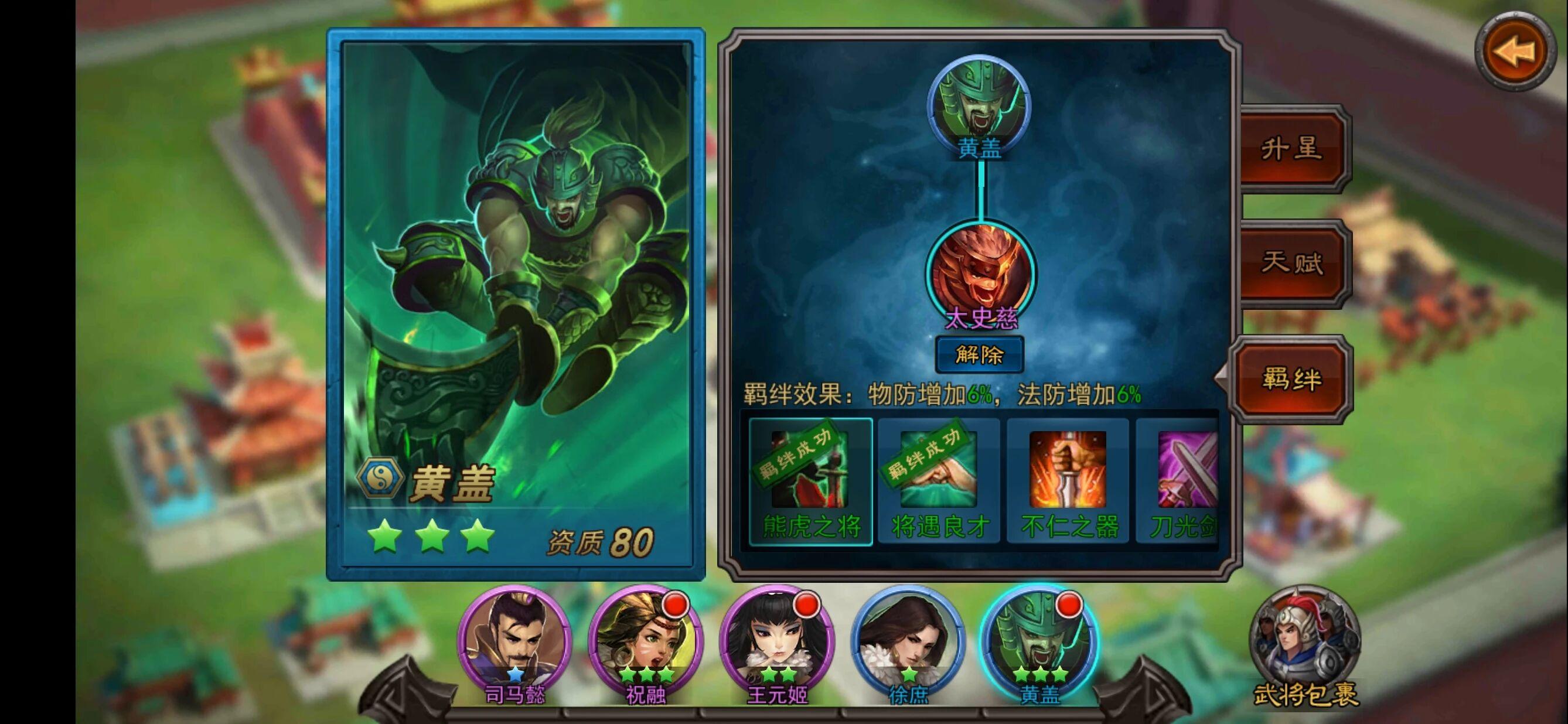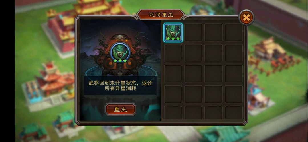 前期,前排很重要,没有更好的前排时可以优先培养黄盖,其次培养司马懿,紫色武将,法术输出还不错。培养错了也不用担心浪费资源,“锻造室—将领重生”可让武将回到未升星状态,并返还所有升星材料,用来培养品质更高的前排。