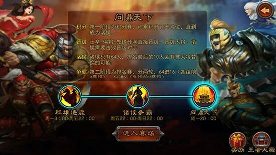 问鼎天下:开启后,玩家可直接跨服进行即时PK。问鼎天下分为三个阶段,第一阶段为“群雄逐鹿”阶段,采用“积分+晋级赛”的形式角出64位玩家。第二阶段为“诸侯争霸”阶段,晋级的64位玩家,最终只有4位玩家晋级最终的“问鼎天下”阶段,获得永久入驻王者大殿的至高荣耀。