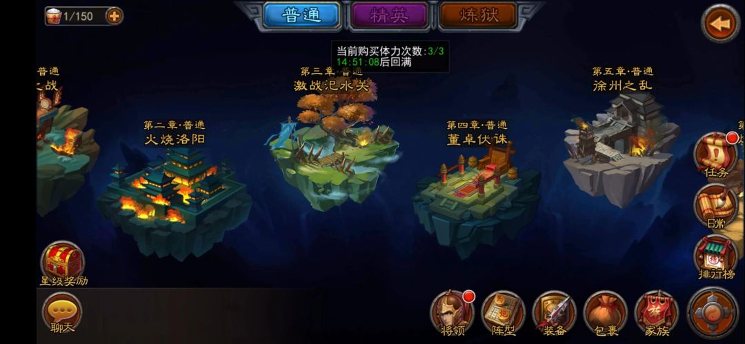 战役分为普通、精英、炼狱三大难度,每个难度只要全部三星通关即可获得星级奖励,里面包含大量的铜币、元宝和材料。另外,只要通关,不管是1星、2星还是3星,都可以通过扫荡获取材料节省时间,所以可以变强后再来挑战3星获取星级奖励。
