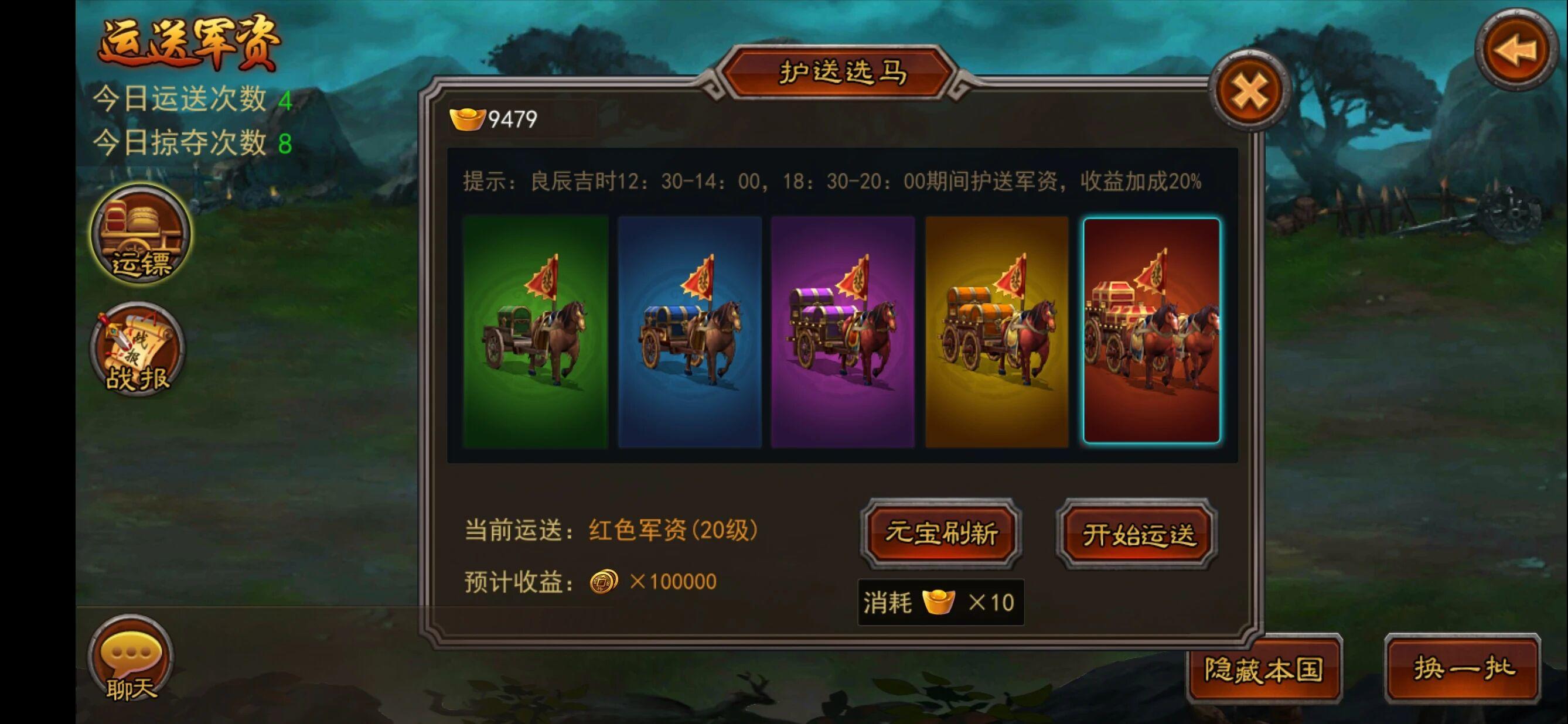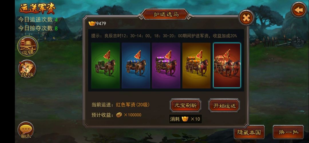 攻城拨寨:优先找橙色矿挖,铁矿、铜币矿都可以,前期不建议挖元宝,主要看你更缺哪个资源。想获得更多资源,可以去抢夺资源多但比你弱的其他玩家。运镖:在12:30-14:00,18:30-20:00期间运镖,有20%的收益加成,尽量选择红色军资车,可以获得更多铜币。如果不想被抢车的话,可以消耗20元宝立即完成护送。