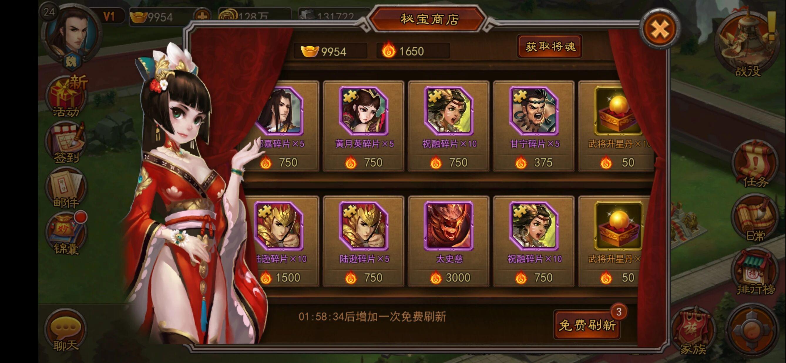秘宝商店:秘宝商店每两小时回复一次免费的次数,里面可以兑换到武将升星丹、武将、武将碎片等物品。其中,武将升星丹必须拿下,因为武将星级越高需要的升星丹越多,后面会非常缺。除此之外,遇到一些自己需要的武将或者武将碎片也可以拿下。