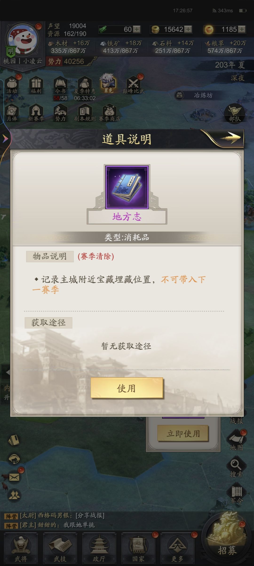 有些朋友可能还不知道军械好处,现介绍如下。军械好处:加属性。操作指南:1.点游戏右下角系统,再点跳出来的左上军械,有锻造石时可升阶加属性。2.进主城,点巡查,获得地方志。3.点击地方志,左上角出现提示,点提示地址,跳转到宝藏所在处,点去该处闪光处,右边选挖掘,派遣武将。4.十分钟后获得锻造石,按第1点说明点击对应兵种装备部位升阶。5.选择需要的属性加点。