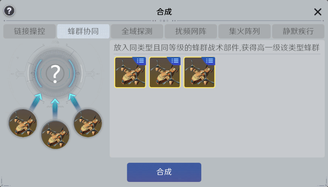 合成功能:战术品质为橙色及以上可进行合成,3个同品种+同名战术=1个更高档新品。