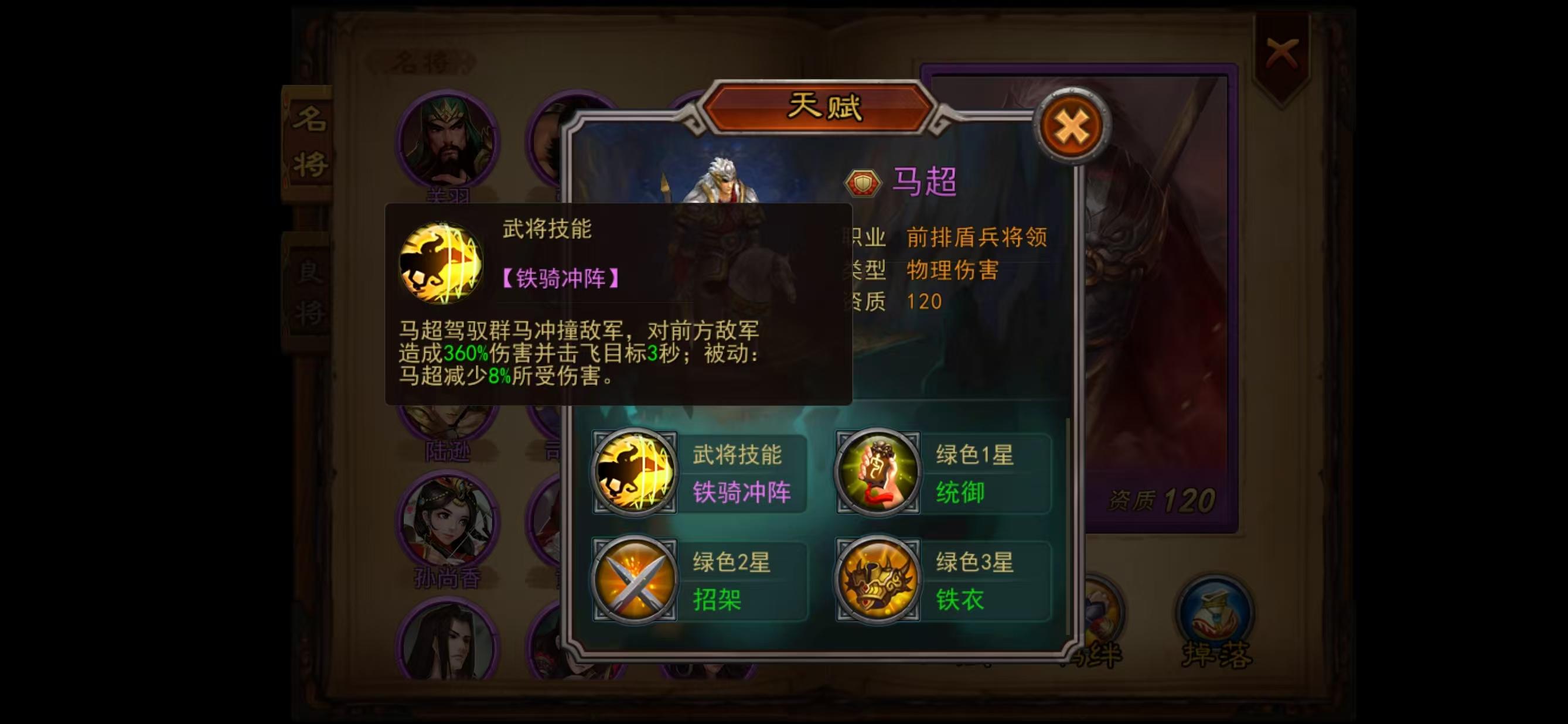 武将技能-铁骑冲锋:对前方敌军造成伤害并击飞目标,被动可减少马超所受伤害。