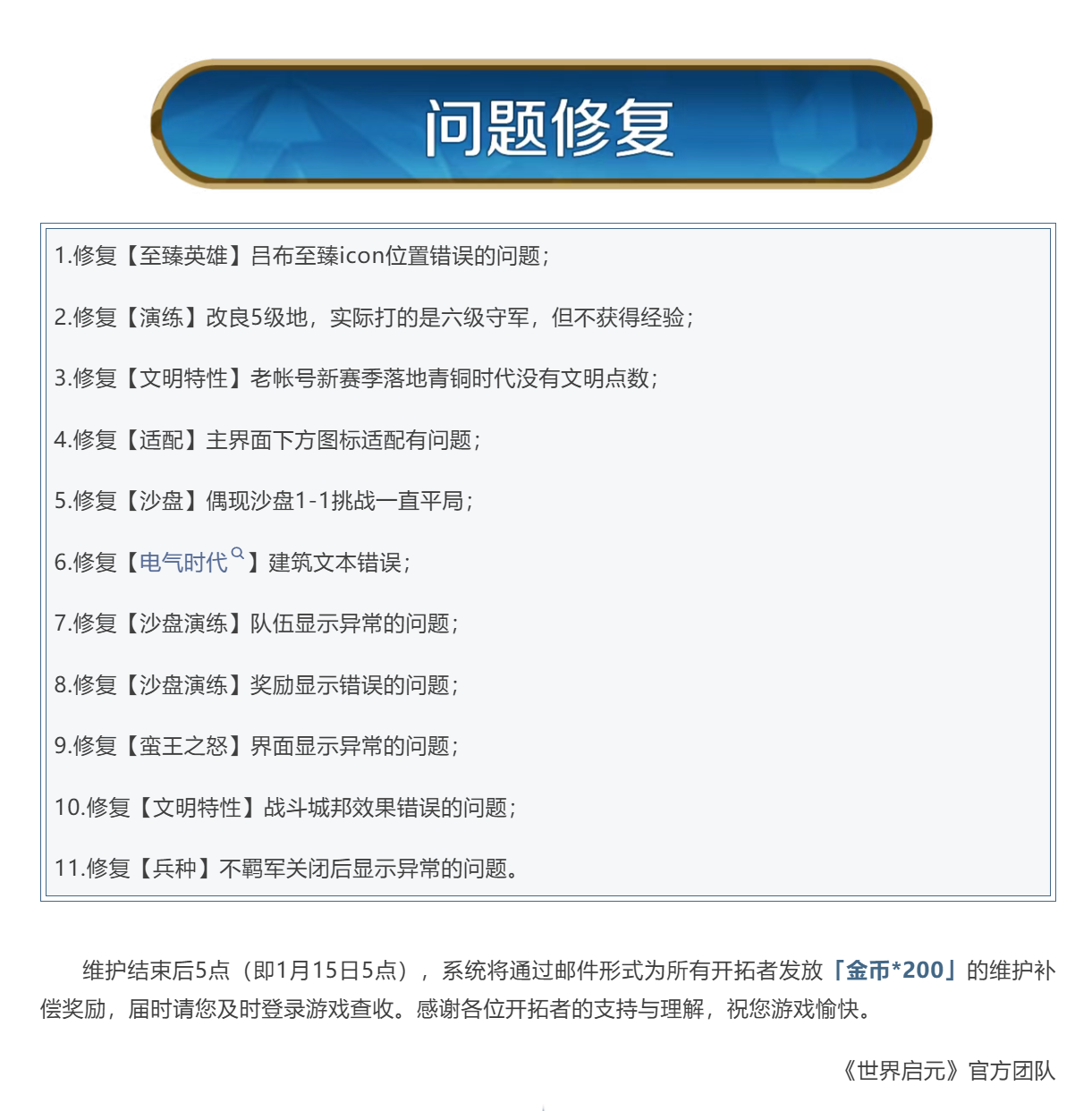 《世界启元》1月15日更新公告