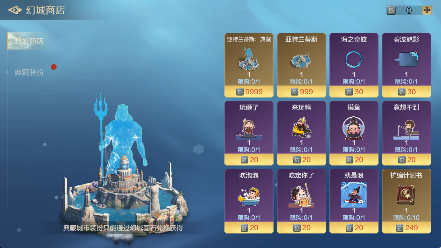 「幻城基石」可以用来兑换「亚特兰蒂斯」普通装扮、典藏装扮以及各种道具。