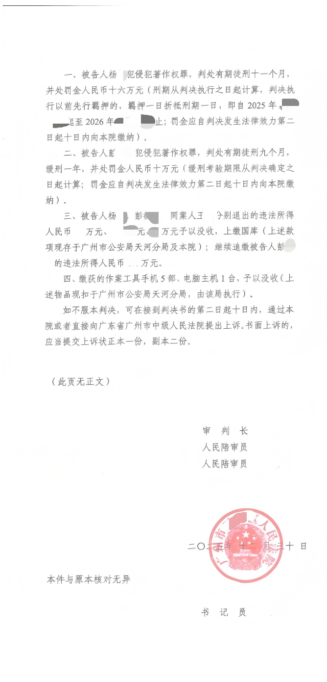 2025年初,公安机关雷霆出击,成功侦破一起跨越两地的私服案件,抓获主要犯罪嫌疑人 2名,近日我方收到法院判决如下:犯罪嫌疑人杨某犯侵犯著作权罪,判处有期徒刑十一个月,并处罚金人民币十六万元;犯罪嫌疑人彭某犯侵犯著作权罪,判处有期徒刑九个月,缓刑一年,并处罚金人民币十万元。其中,杨某被判处实刑,服刑坐牢十一个月。