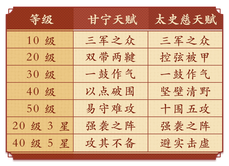 甘宁与太史慈的天赋搭配如下表: