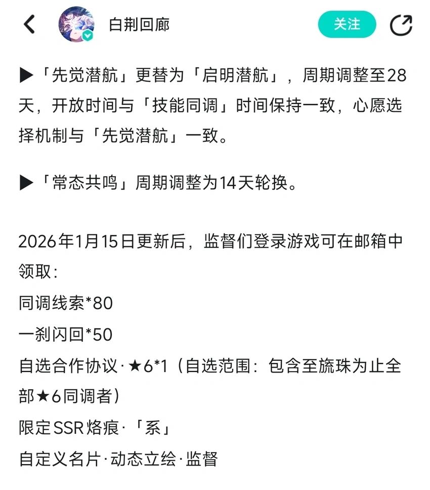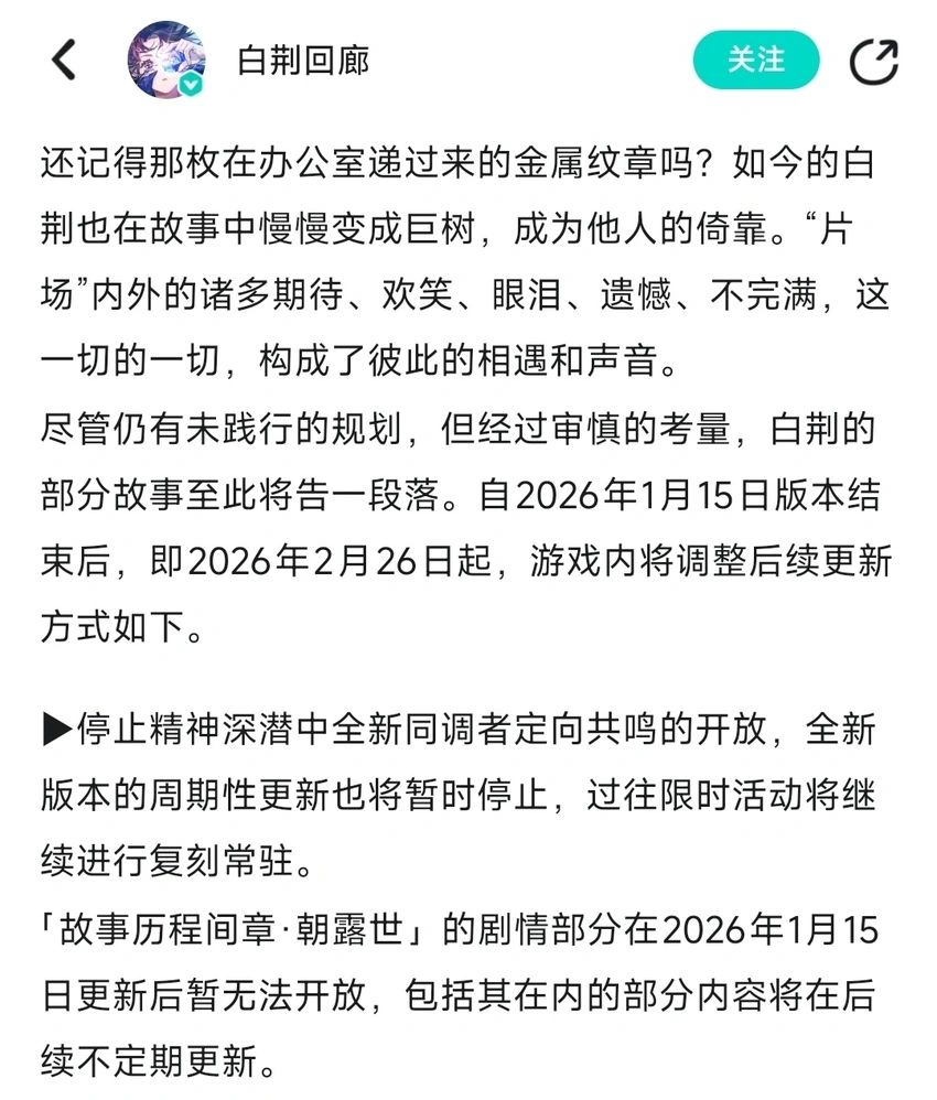 2026年1月14日,就在迎来二周年庆典的第二天,《白荆回廊》项目组发布公告,宣布游戏将停止部分内容更新。这款由上海烛龙研发、腾讯发行的二次元游戏承认,当前开发能力已无法保证新内容的稳定产出,从2026年2月26日起,游戏将停止全新同调者的开放,全新版本的周期性更新也将暂停,原本预计1月15日上线的周年庆剧情内容“故事历程间章·朝露世”无法如期开放![[TapTap表情|TapFamilyxdoro2_粉狗比心]](https://img.tapimg.com/market/images/101c7e3200596fe8e03765080b467fb8.gif)