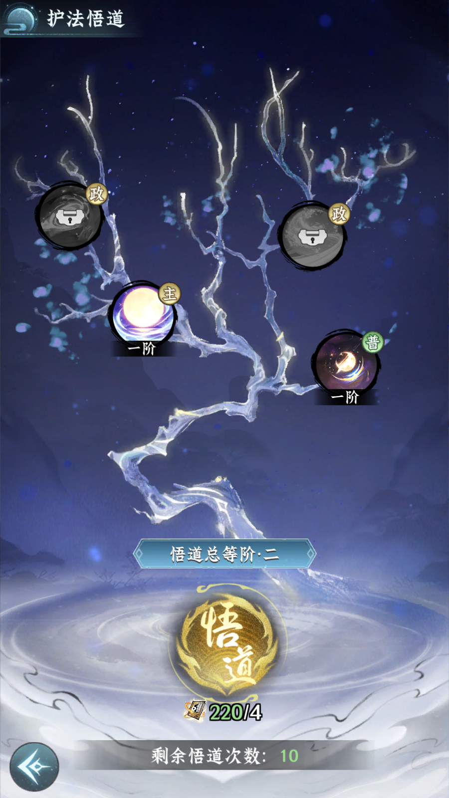 每五次证道便可提升一次悟道等阶,悟道等阶提升后可获得多次领悟道法的机会,每次领悟都将消耗对应品质的道书随机提升一个道法的等级。