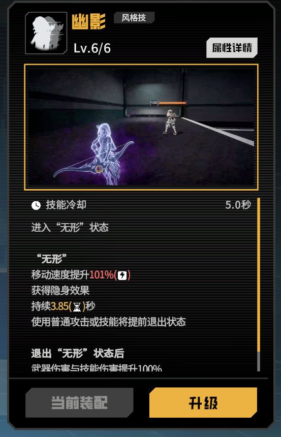 提升移速并进入隐形,持续一段时间,使用技能或普攻会破隐并增加武器与技能伤害,持续一段时间