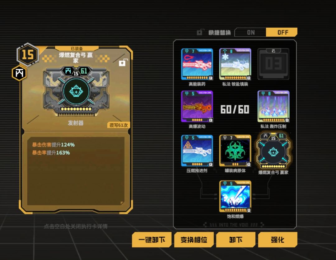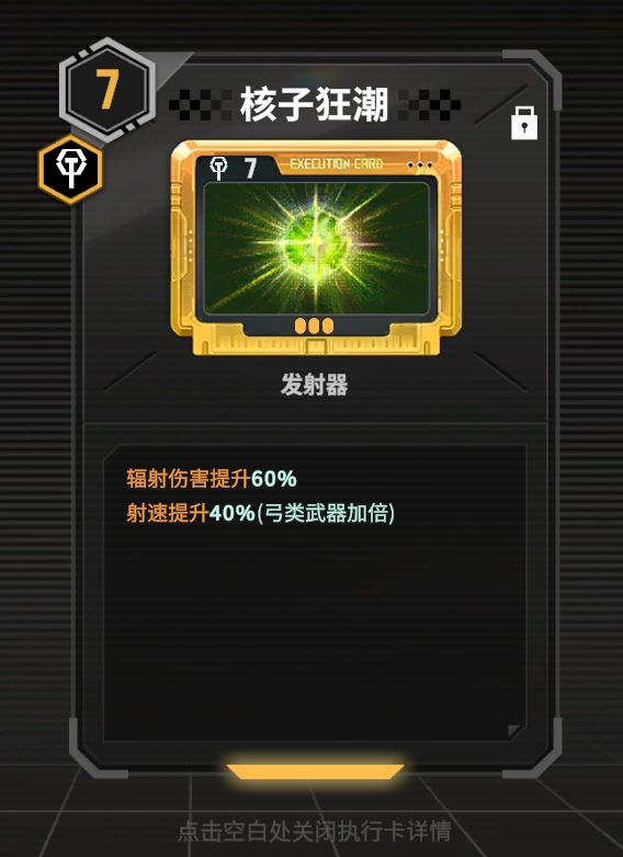 因为爆燃复合弓的基础触发几率高,剩下一个卡槽可以考虑核子狂潮来触发辐射异常减少敌人护甲
