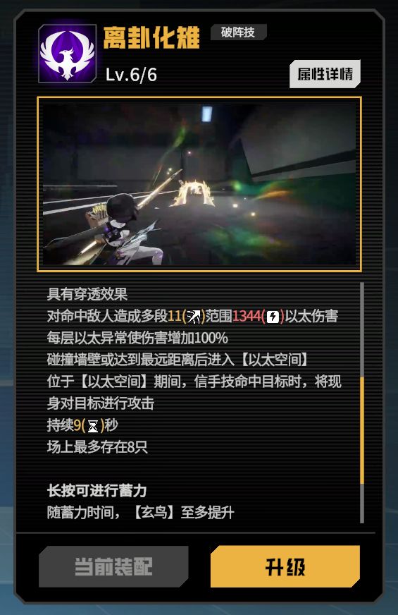 发射一只玄鸟(大运来咯),贯穿敌人造成多段范围(以训练场白猿座为例有大约12段)以太伤害,且会根据敌人身上的以太效果增加伤害,该增伤为乘法计算,即敌人身上每有一层以太效果伤害增加1倍最多增加10倍,再加上蓄力与风格技1的增伤也为乘法计算,所以该技能的最终增伤效果能达到原来(即不蓄力,0层以太异常)的40倍(数值吓哭了),玄鸟碰壁或者达到最远距离后会储存一段时间,且数量可以堆叠,最多堆叠8只,当信手技(1、2都可以)命中敌人时,根据储存的层数,在信手技命中的敌人召唤与之相当数量的玄鸟进行攻击