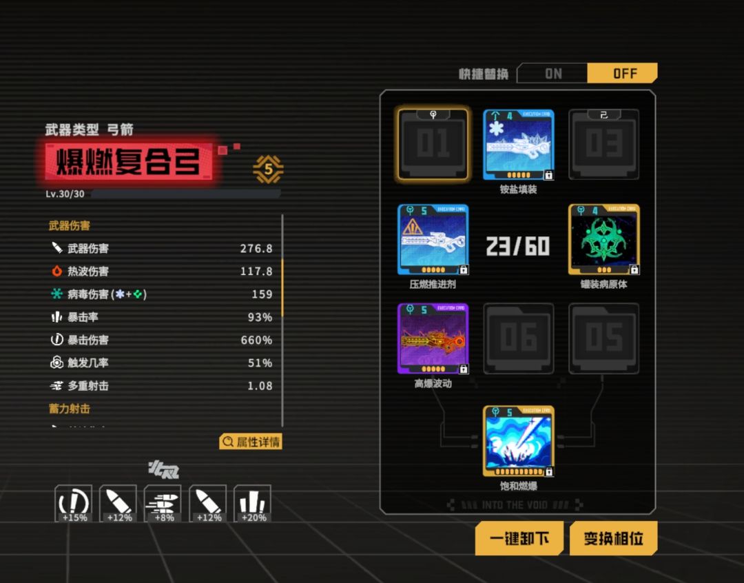 一般只需考虑增加暴击与爆伤,但爆燃复合弓可以使用铵盐装填与罐装病原体来组成病毒与增加触发